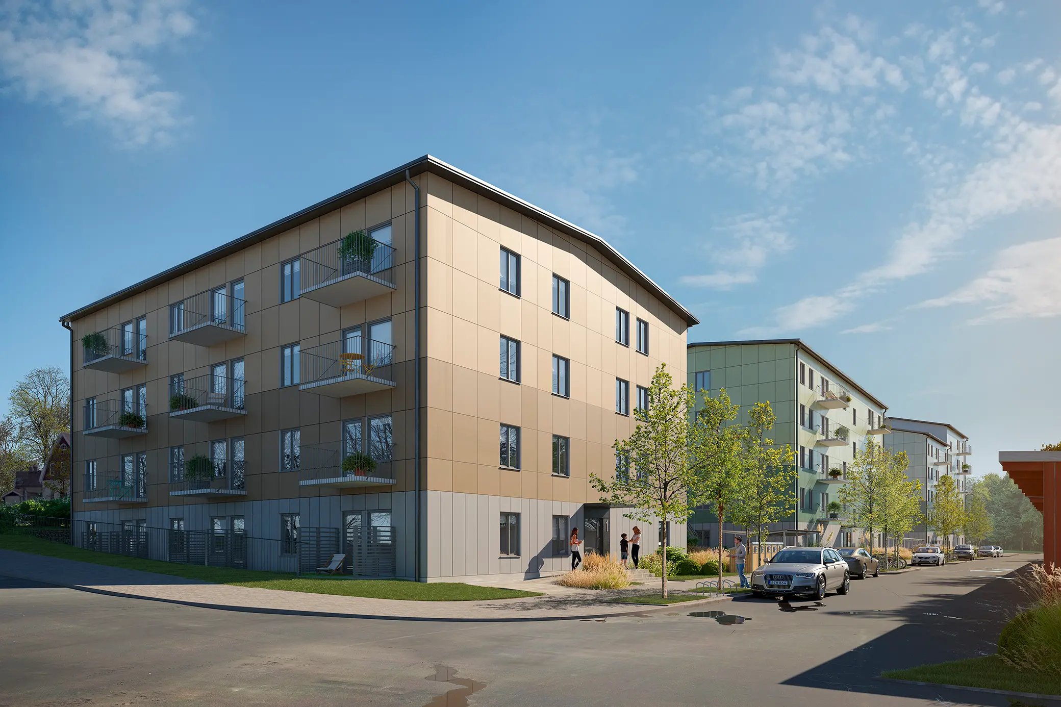 Vid Nynäsgårds station har Nynäshamns bostäder byggt tre nya flerbostadshus med 95 hyreslägenheter, med inflyttning 2024.